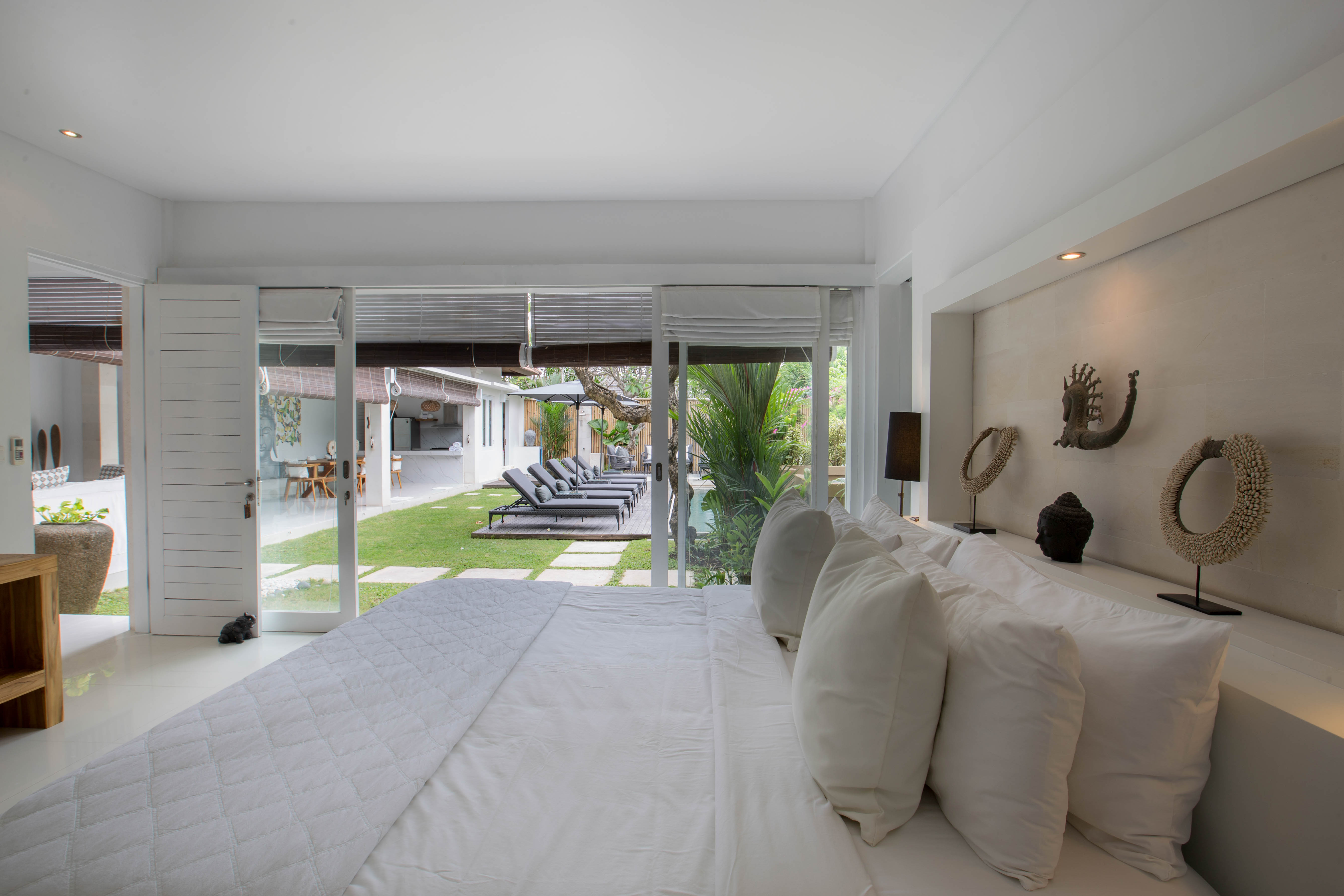The bedroom is airconditioned and is accessible from the garden area via sliding doors which can be opened to create an open plan living space or kept shut for privacy.